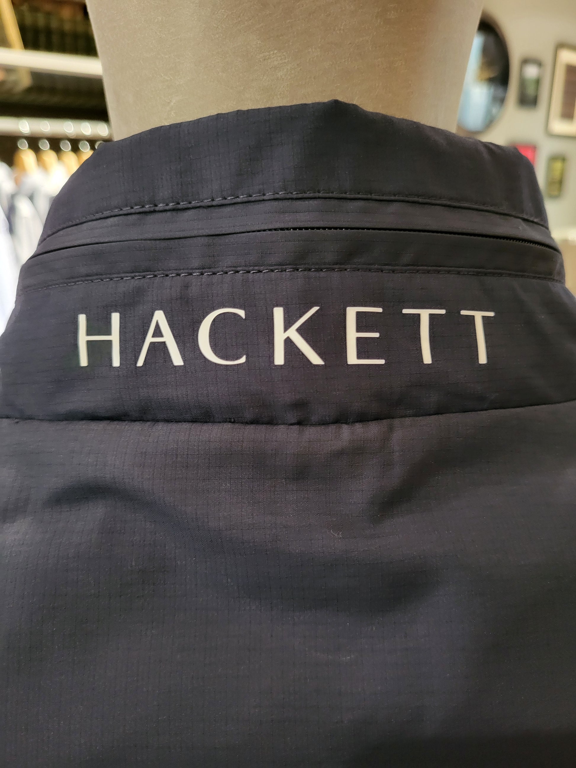 capuche dissimulée dans le col, compartiment fermé par une fermeture éclaire avec inscription Hackett sur celui-ci
